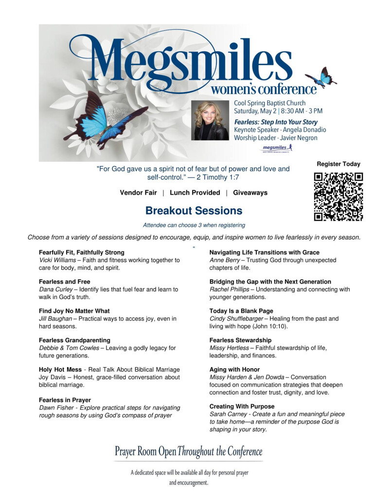 Join us for a meaningful day of fellowship, encouragement, and spiritual growth. Fearless: Step Into Your Story is an invitation to pause, reflect, and discover how God is faithfully at work in your story—even in places that feel unfinished, broken, or uncertain.